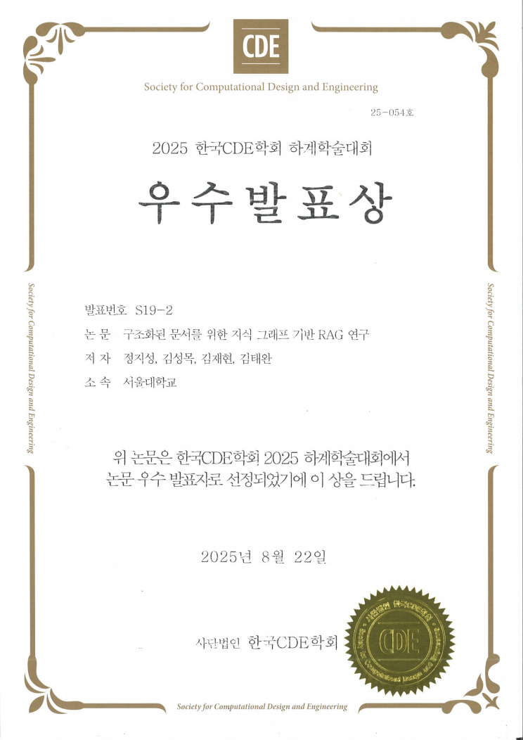 2025년 8월 한국CDE학회 하계학술대회에서 "구조화된 문서를 위한 지식 그래프 기반 RAG 연구" 란 주제로 정지성 박사과정이 우수발표상을 수상했다.
